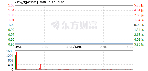 以下是*ST元成在北京时间10月27日09:26分盘口异动快照:10月27日9点26分,
