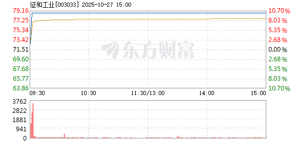征和工业盘中涨停,报78.66元,目前封单34165手,折合2.69亿元。截至目前,成交3219.10万元,换手率0.53%。