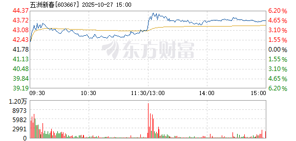 五洲新春盘中快速上涨,5分钟内涨幅超过2%,截至9点33分,报43.17元,成交9083.17万元,换手率0.58%。