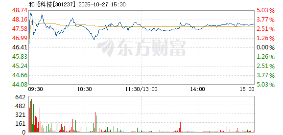和顺科技盘中快速回调,5分钟内跌幅超过2%,截至9点36分,报47.35元,成交1260.02万元,换手率0.40%。