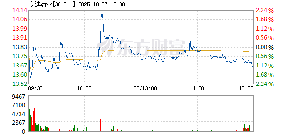 亨迪药业盘中快速反弹,5分钟内涨幅超过2%,截至9点36分,报13.85元,成交4126.02万元,换手率0.72%。