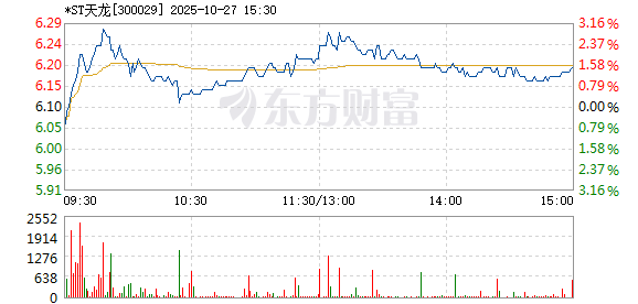 *ST天龙盘中快速上涨,5分钟内涨幅超过2%,截至9点37分,报6.26元,成交562.61万元,换手率0.46%。