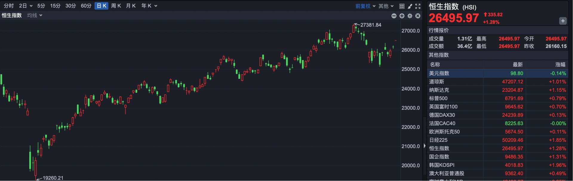 截至发稿,恒生指数报26495.97点,上涨335.82点,涨幅1.28%。