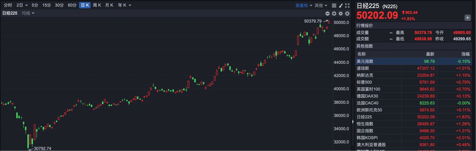 今日亚太股市全线走强,日经指数大涨904点,历史上首次突破50000点大关,盘中最高报50379.79点。截至发稿,日经指数报50202点,涨幅1.83%。
