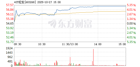 *ST松发盘中涨停,报57.38元,目前封单1310手,折合751.68万元。截至目前,成交1.43亿元,换手率2.04%。