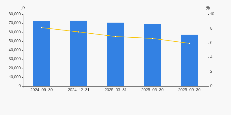 截至2025年9月30日,公司最新总股本为8.82亿股,其中流通股本为6.92亿股。户均持有流通股数量由上期的1万股上升至1.21万股,户均流通市值7.21万元。