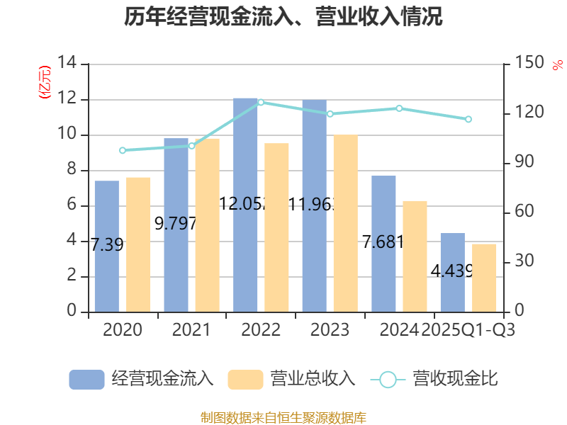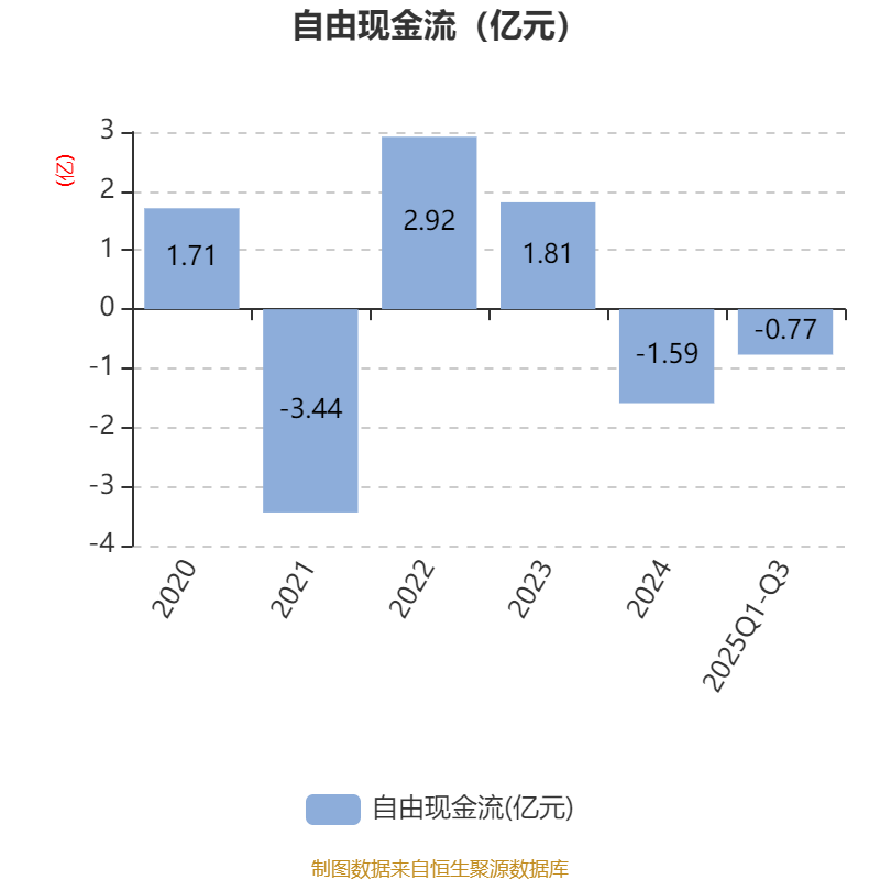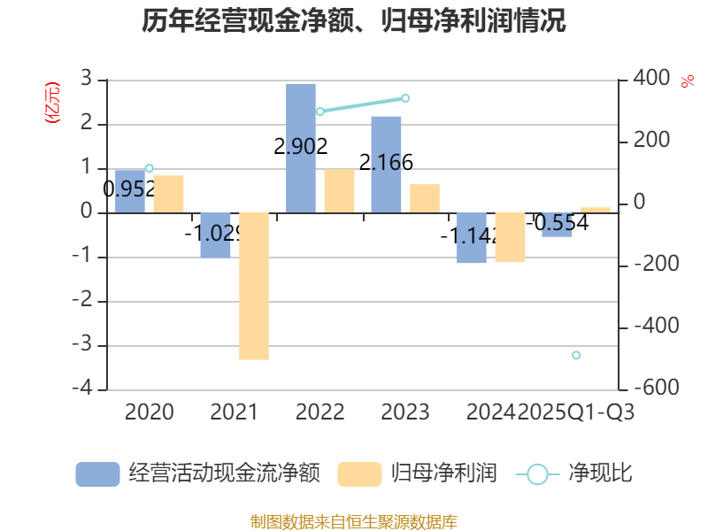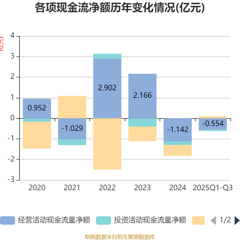 2025年前三季度,公司经营活动现金流净额为-5544.1万元,同比增加6851.14万元;筹资活动现金流净额973.36万元,同比增加5842.44万元;投资活动现金流净额-643.41万元,上年同期为936.13万元。