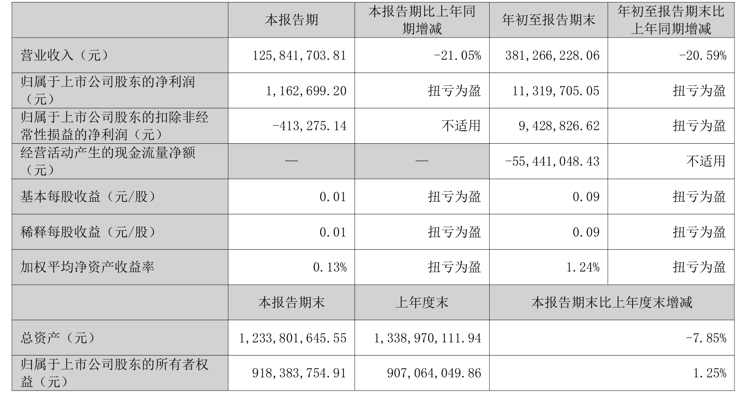 中证智能财讯友邦吊顶(002718)10月28日披露2025年第三季度报告。前三季度公司实现营业总收入3.81亿元,同比下降20.59%;归母净利润1131.97万元,同比扭亏;扣非净利润942.88万元,同比扭亏;经营活动产生的现金流量净额为-5544.1万元,上年同期为-1.24亿元;报告期内,友邦吊顶基本每股收益为0.09元,加权平均净资产收益率为1.24%。