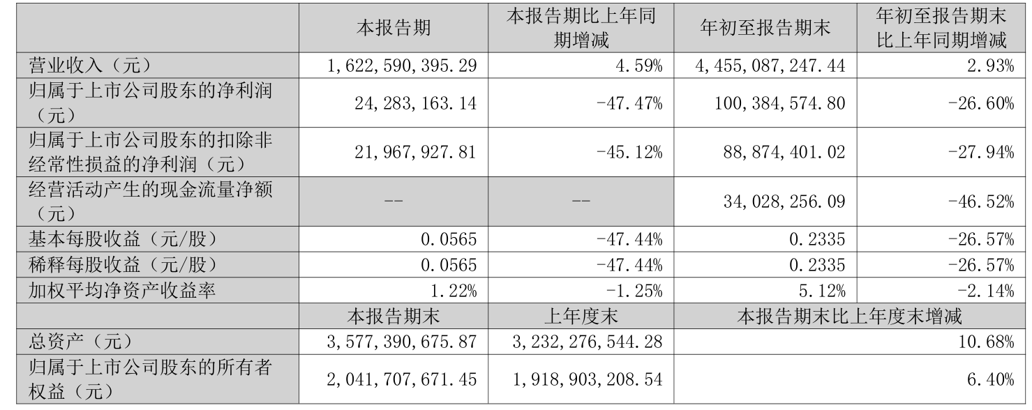 中证智能财讯隆华新材(301149)10月28日披露2025年第三季度报告。前三季度公司实现营业总收入44.55亿元,同比增长2.93%;归母净利润1亿元,同比下降26.60%;扣非净利润8887.44万元,同比下降27.94%;经营活动产生的现金流量净额为3402.83万元,同比下降46.52%;报告期内,隆华新材基本每股收益为0.2335元,加权平均净资产收益率为5.12%。