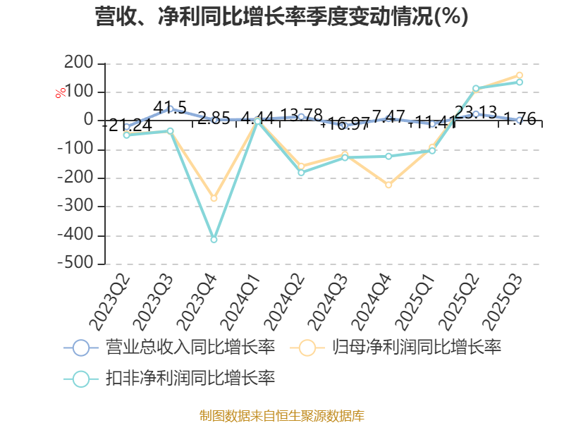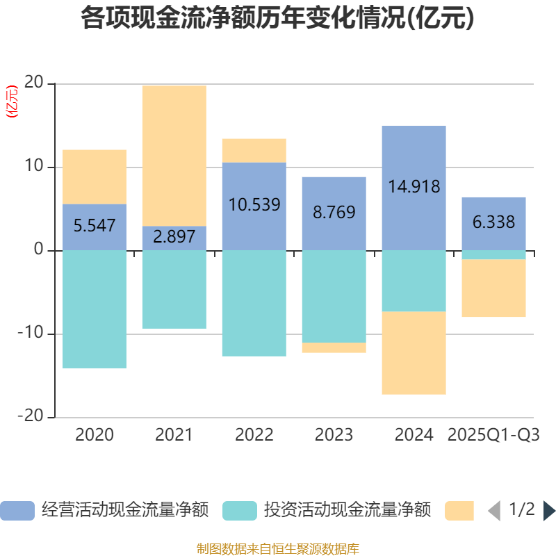 2025年前三季度,公司经营活动现金流净额为6.34亿元,同比增长4.96%;筹资活动现金流净额-6.89亿元,同比减少6.1亿元;投资活动现金流净额-1.12亿元,上年同期为-5.56亿元。