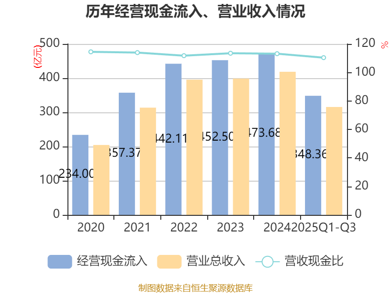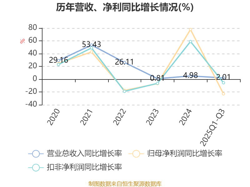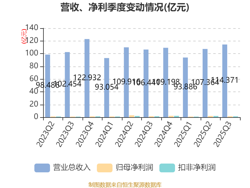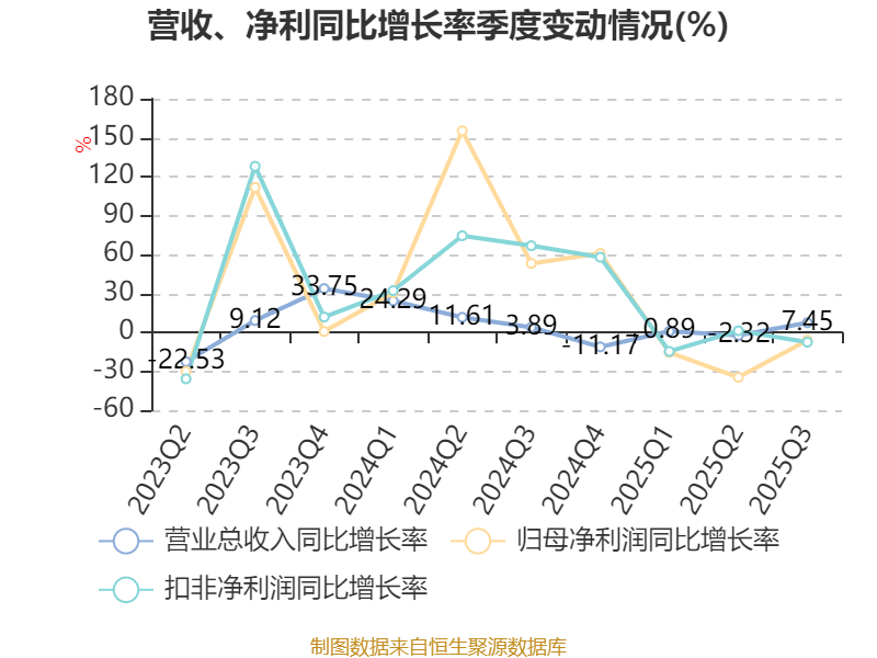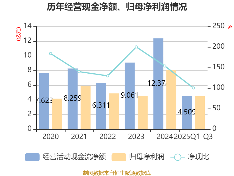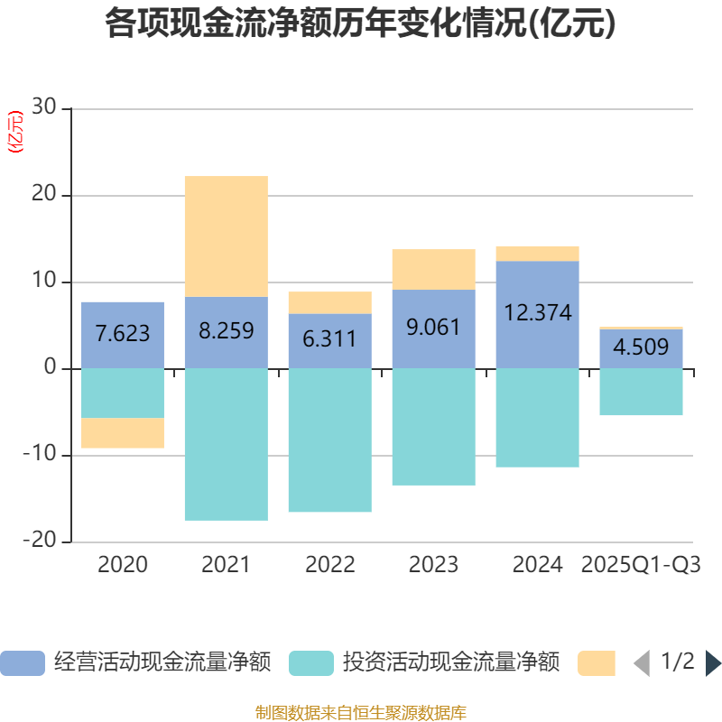 2025年前三季度,公司经营活动现金流净额为4.51亿元,同比增长2.43%;筹资活动现金流净额2771.96万元,同比减少1.81亿元;投资活动现金流净额-5.42亿元,上年同期为-5.94亿元。