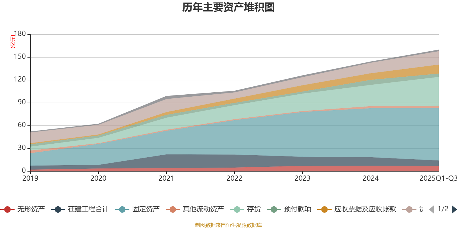 资产重大变化方面,截至2025年三季度末,公司存货较上年末增加35.79%,占公司总资产比重上升4.37个百分点;在建工程合计较上年末减少37.03%,占公司总资产比重下降3.37个百分点;预付款项较上年末减少33.42%,占公司总资产比重下降1.84个百分点;固定资产较上年末增加6.79%,占公司总资产比重下降1.63个百分点。