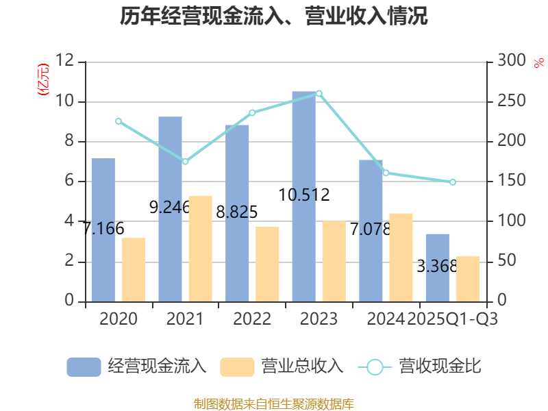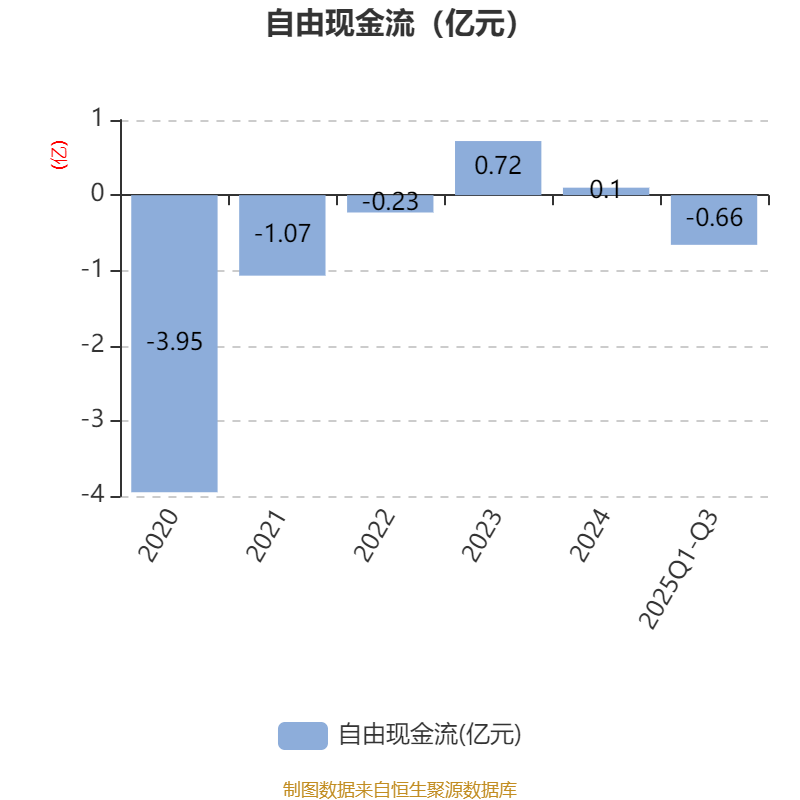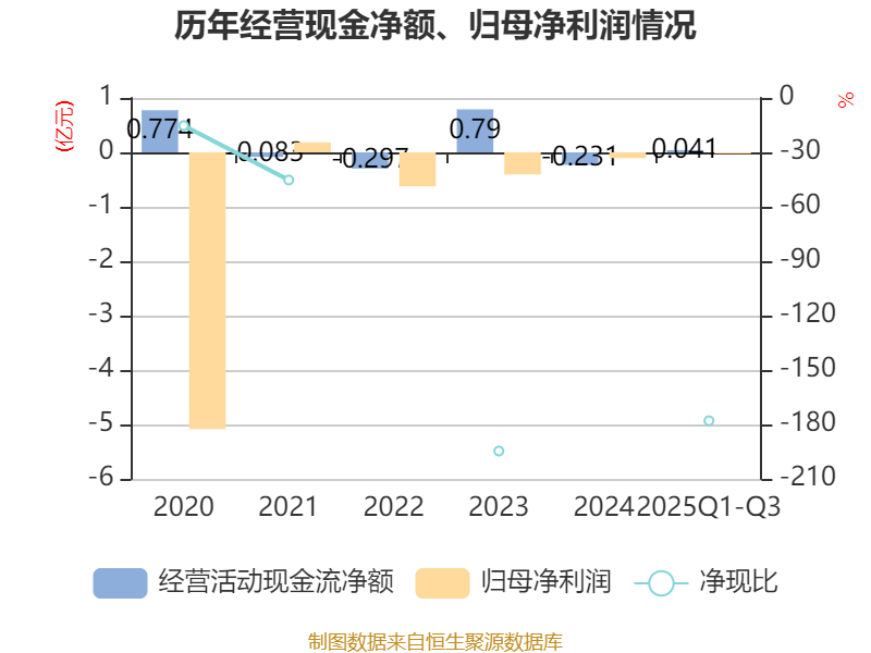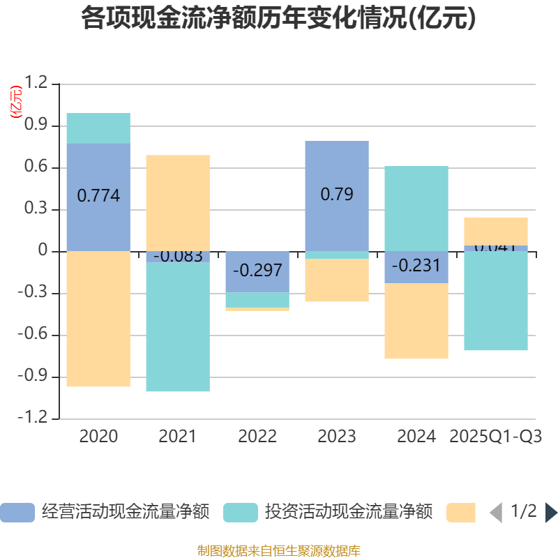 2025年前三季度,公司经营活动现金流净额为409.83万元,同比下降86.4%;筹资活动现金流净额1991.89万元,同比增加1.07亿元;投资活动现金流净额-7114.94万元,上年同期为-809.1万元。