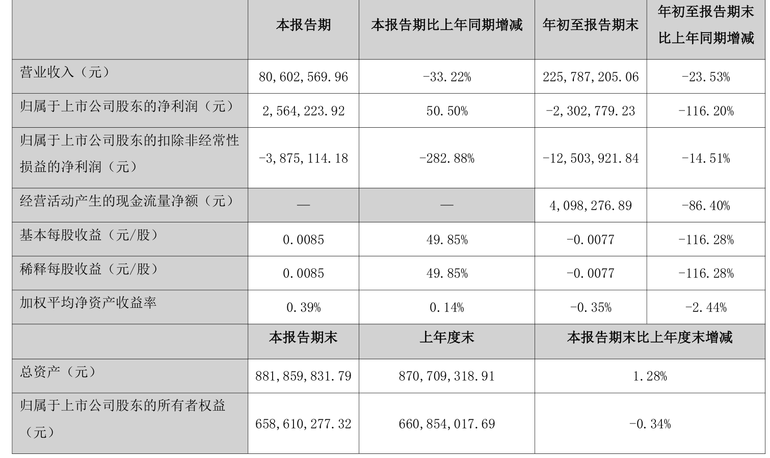 中证智能财讯恒大高新(002591)10月28日披露2025年第三季度报告。前三季度公司实现营业总收入2.26亿元,同比下降23.53%;归母净利润亏损230.28万元,上年同期盈利1421.42万元;扣非净利润亏损1250.39万元,上年同期亏损1091.97万元;经营活动产生的现金流量净额为409.83万元,同比下降86.40%;报告期内,恒大高新基本每股收益为-0.0077元,加权平均净资产收益率为-0.35%。