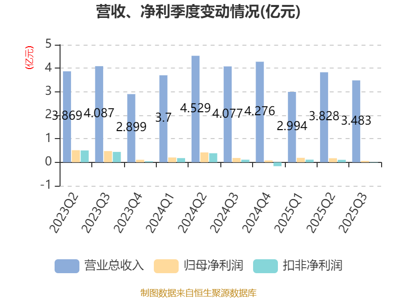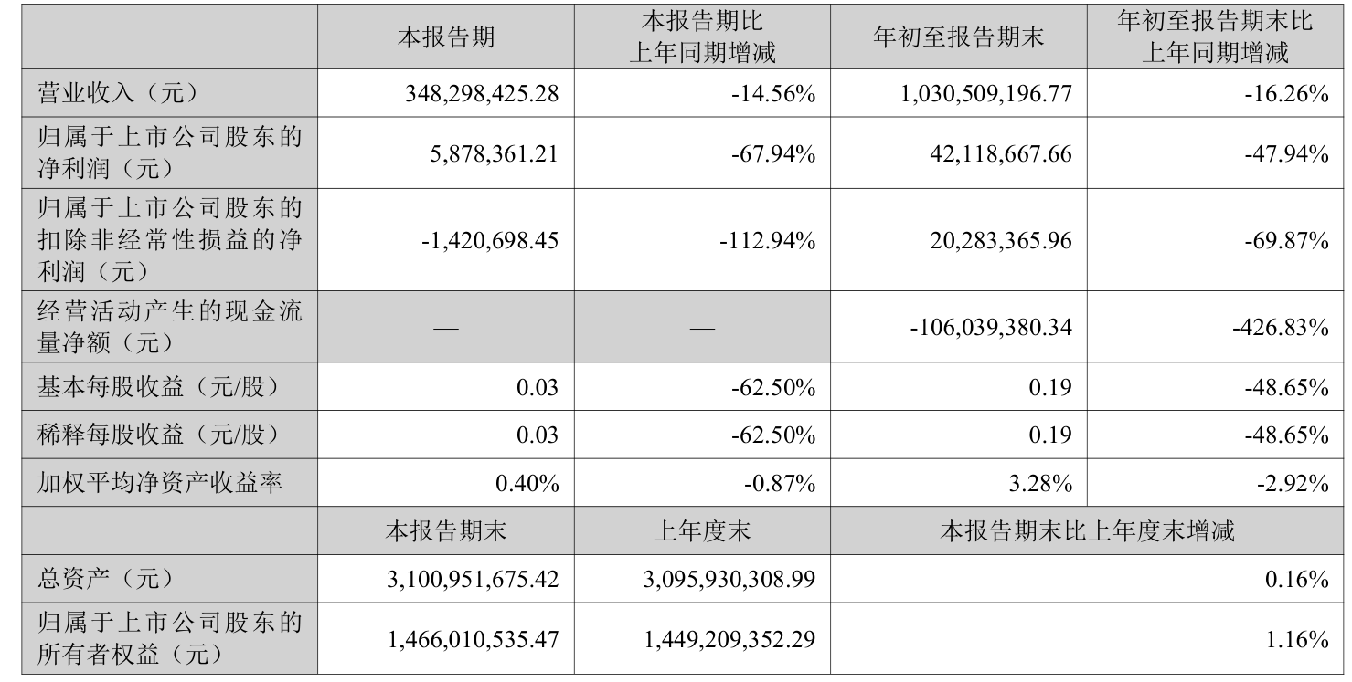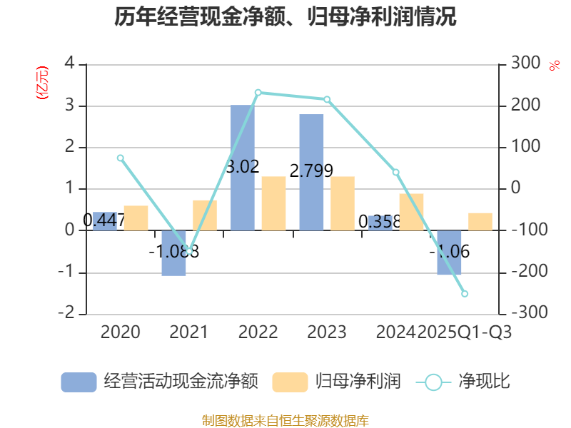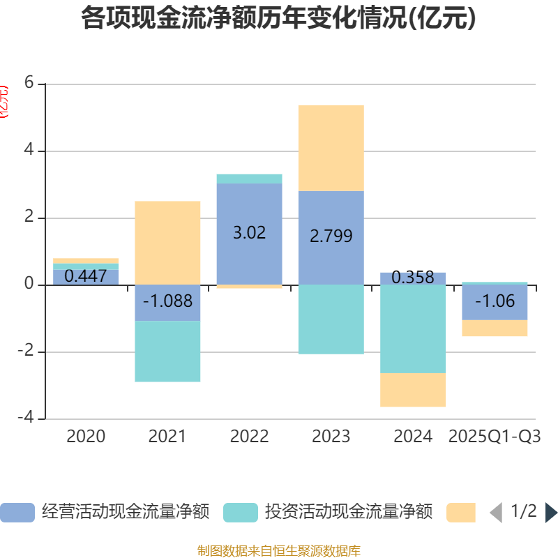 2025年前三季度,公司经营活动现金流净额为-1.06亿元,同比减少1.38亿元;筹资活动现金流净额-4851.73万元,同比增加2480.39万元;投资活动现金流净额761.87万元,上年同期为-2.45亿元。
