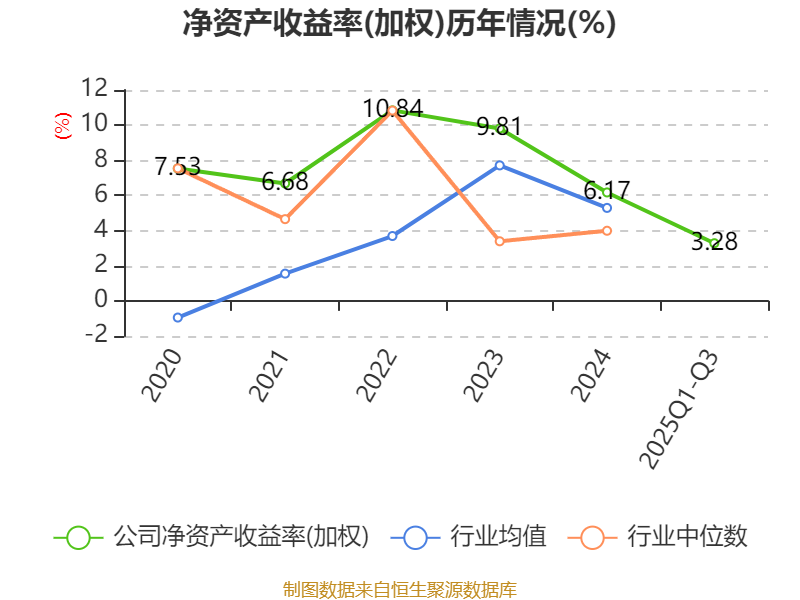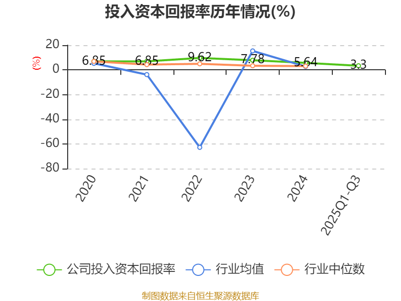 盈利能力方面, 2025年前三季度公司加权平均净资产收益率为3.28%,同比下降2.92个百分点。公司2025年前三季度投入资本回报率为3.3%,较上年同期下降1.69个百分点。
