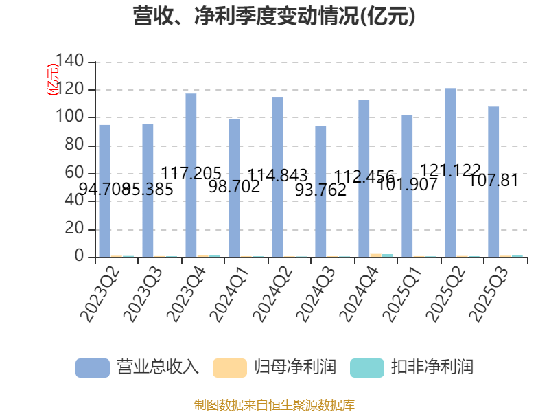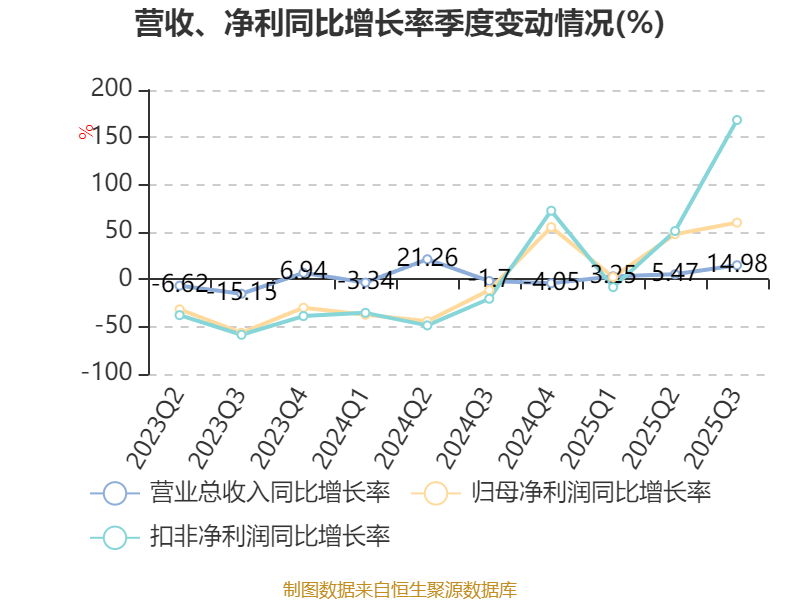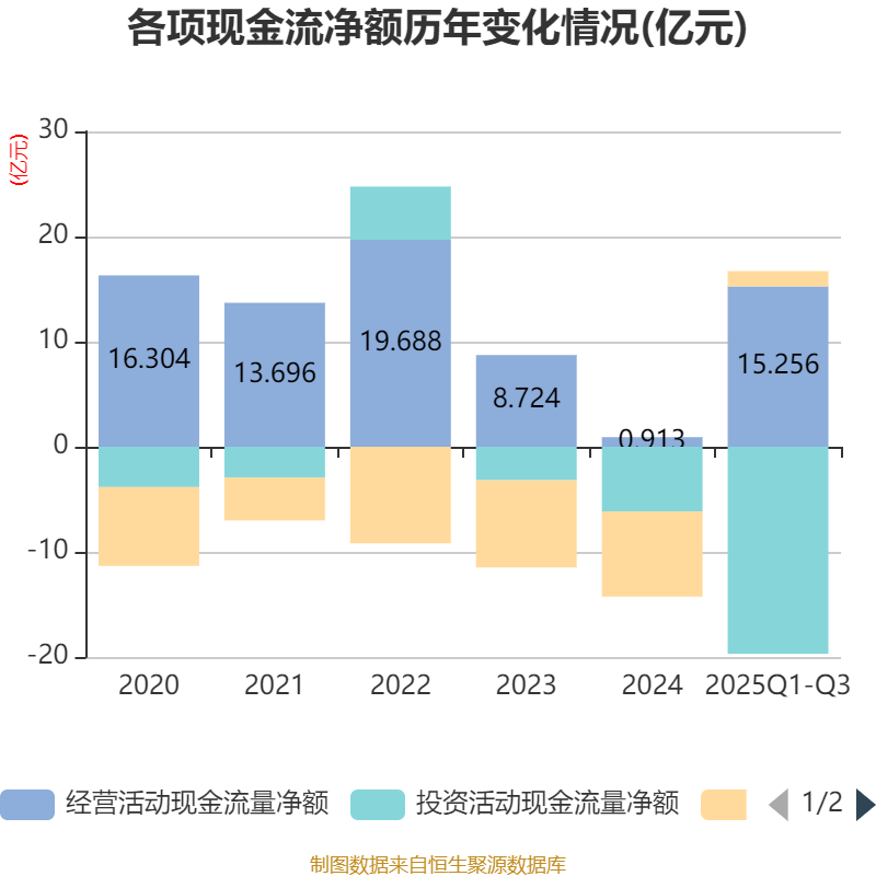 2025年前三季度,公司经营活动现金流净额为15.26亿元,同比增长709.25%;筹资活动现金流净额1.45亿元,同比增加8.09亿元;投资活动现金流净额-19.7亿元,上年同期为-4.56亿元。