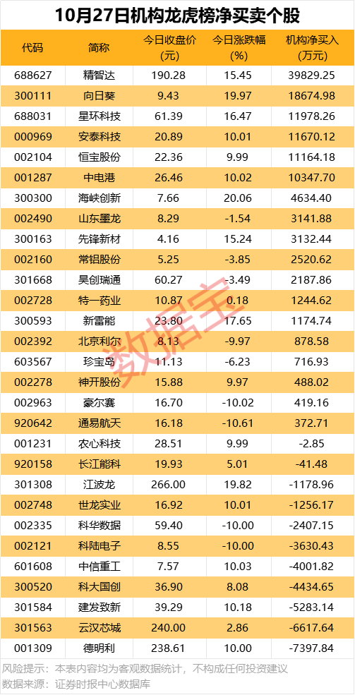 今日龙虎榜中,机构净买入的个股18只,净卖出的个股11只。6股净买入金额均超1亿元,精智达获机构净买入3.98亿元;向日葵、星环科技、安泰科技,分别获净买入1.87亿元、1.2亿元 、1.17亿元。