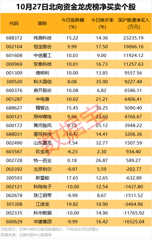 今日龙虎榜现身个股中,15股获北向资金净买入,伟测科技、恒宝股份、中信重工、安泰科技净买入金额居前,分别为2.32亿元、1.91亿元、1.19亿元、1.13亿元。其中恒宝股份、安泰科技均获机构和北上资金同时大幅买入超1亿元。