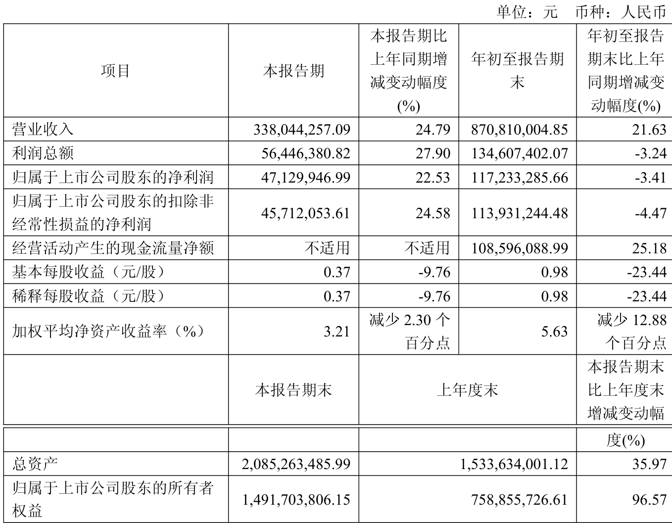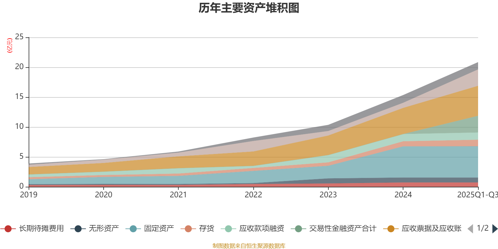 资产重大变化方面,截至2025年三季度末,公司交易性金融资产合计占公司总资产的13.4%,上年末为0;固定资产较上年末增加0.49%,占公司总资产比重下降8.88个百分点;货币资金较上年末增加215.94%,占公司总资产比重上升7.5个百分点;应收票据及应收账款较上年末增加14.43%,占公司总资产比重下降4.52个百分点。