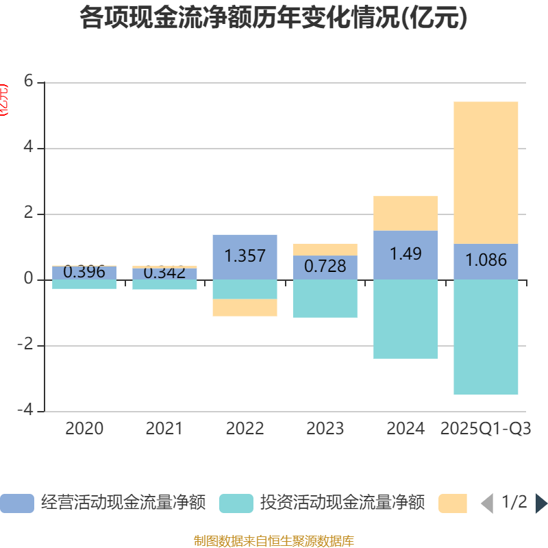 2025年前三季度,公司经营活动现金流净额为1.09亿元,同比增长25.18%;筹资活动现金流净额4.32亿元,同比增加3.04亿元;投资活动现金流净额-3.5亿元,上年同期为-1.87亿元。