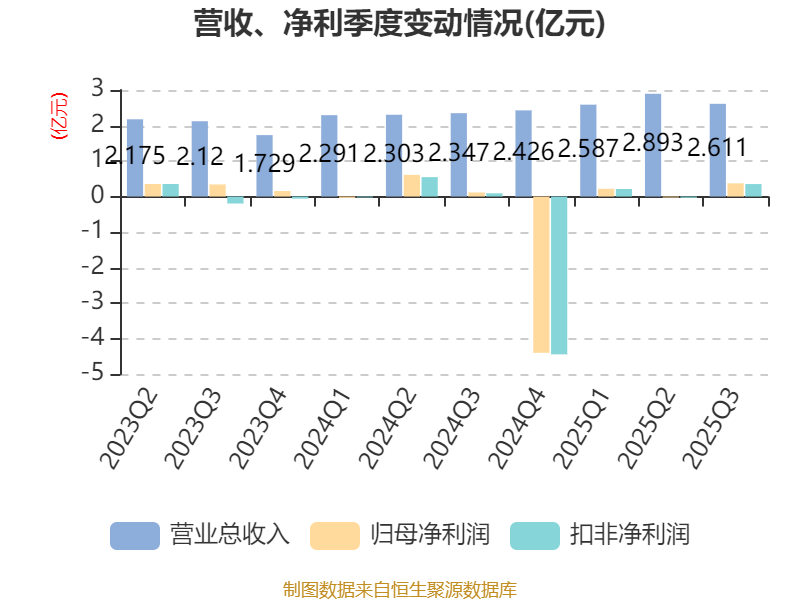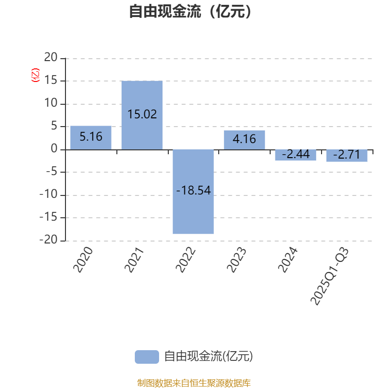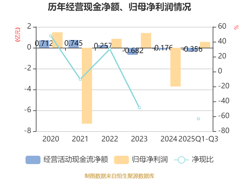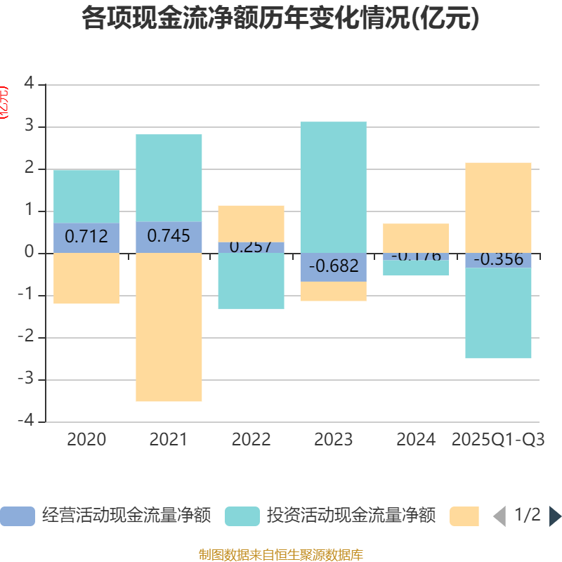 2025年前三季度,公司经营活动现金流净额为-3558.49万元,同比增加1624.81万元;筹资活动现金流净额2.14亿元,同比增加1.54亿元;投资活动现金流净额-2.14亿元,上年同期为-6284.67万元。