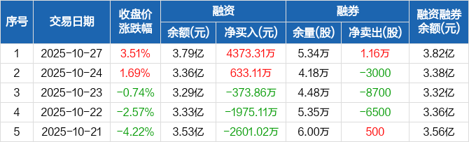 融资方面,当日融资买入8099.37万元,融资偿还3726.06万元,融资净买入4373.31万元。融券方面,融券卖出1.18万股,融券偿还200股,融券余量5.34万股,融券余额302.35万元。融资融券余额合计3.82亿元。
