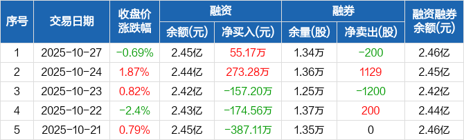 融资方面,当日融资买入1268.4万元,融资偿还1213.23万元,融资净买入55.17万元。融券方面,融券卖出0股,融券偿还200股,融券余量1.34万股,融券余额71.98万元。融资融券余额合计2.46亿元。