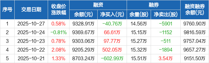 融资方面,当日融资买入1104.27万元,融资偿还1145.03万元,融资净偿还40.76万元。融券方面,融券卖出0股,融券偿还5901股,融券余量14.56万股,融券余额431.99万元。融资融券余额合计9760.9万元。