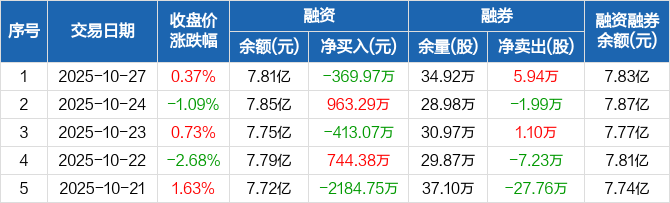 融资方面,当日融资买入2144.22万元,融资偿还2514.19万元,融资净偿还369.97万元。融券方面,融券卖出6.31万股,融券偿还3700股,融券余量34.92万股,融券余额190.33万元。融资融券余额合计7.83亿元。