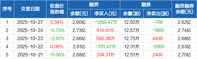 融资方面,当日融资买入1006.34万元,融资偿还2266.81万元,融资净偿还1260.47万元。融券方面,融券卖出4700股,融券偿还5400股,融券余量12.5万股,融券余额187万元。融资融券余额合计2.62亿元。