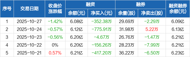 融资方面,当日融资买入2850.9万元,融资偿还3203.29万元,融资净偿还352.38万元,连续5日净偿还累计1706.43万元。融券方面,融券卖出1300股,融券偿还2.42万股,融券余量29.69万股,融券余额102.73万元。融资融券余额合计6.09亿元。