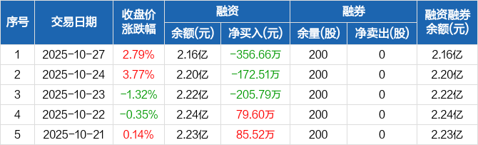 融资方面,当日融资买入1539.91万元,融资偿还1896.57万元,融资净偿还356.66万元,连续3日净偿还累计734.97万元。融券方面,融券卖出0股,融券偿还0股,融券余量200股,融券余额6050元。融资融券余额合计2.16亿元。