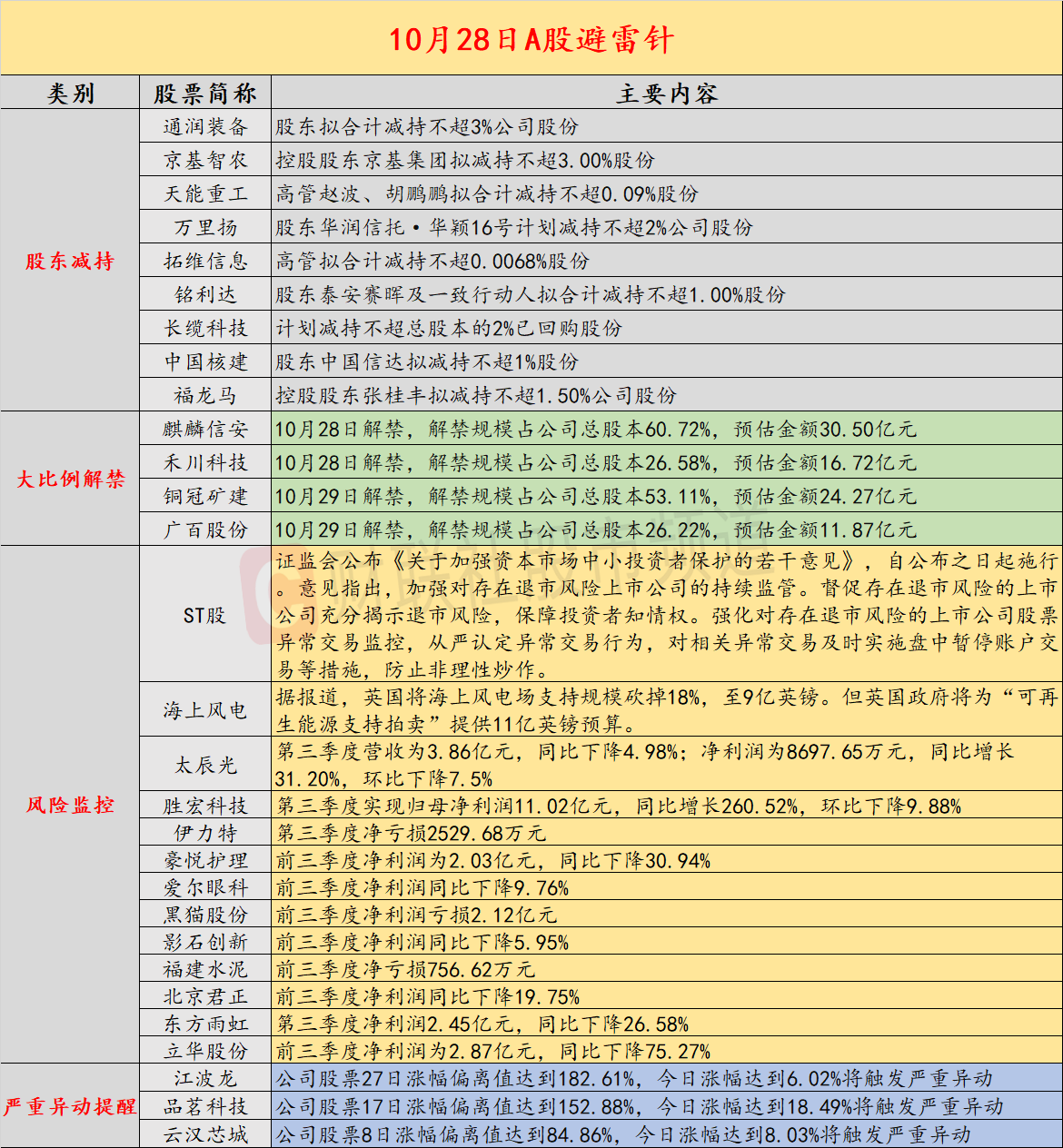 导读:近日,A股及海外市场潜在风险事件如下。国内经济信息方面包括:1)证监会强化对存在退市风险的上市公司股票异常交易监控,从严认定异常交易行为;2)10月27日,25年飞天茅台原箱较前一日下跌20元;公司方面重点关注包括:1)胜宏科技第三季度实现归母净利润11.02亿元,同比增长260.52%,环比下降9.88%;2)太辰光:第三季度营收为3.86亿元,同比下降4.98%;净利润为8697.65万元,同比增长31.20%,环比下降7.5%;海外市场重点关注包括:1)国际贵金属期货大幅收跌超3%;2)英国将海上风电场支持规模砍掉18%,至9亿英镑。