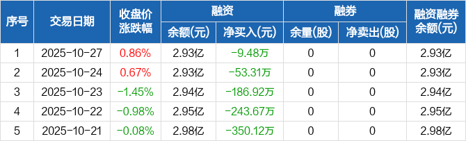 融资方面,当日融资买入982.29万元,融资偿还991.77万元,融资净偿还9.48万元,连续5日净偿还累计843.5万元。融券方面,融券卖出0股,融券偿还0股,融券余量0股,融券余额0元。融资融券余额合计2.93亿元。