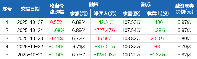 融资方面,当日融资买入3113.75万元,融资偿还3126.07万元,融资净偿还12.31万元。融券方面,融券卖出0股,融券偿还100股,融券余量107.53万股,融券余额793.57万元。融资融券余额合计6.97亿元。