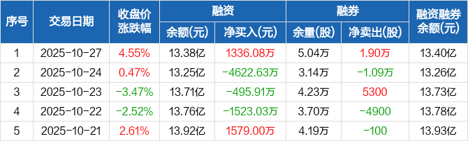 融资方面,当日融资买入1.62亿元,融资偿还1.49亿元,融资净买入1336.08万元。融券方面,融券卖出2.35万股,融券偿还4500股,融券余量5.04万股,融券余额189.81万元。融资融券余额合计13.4亿元。