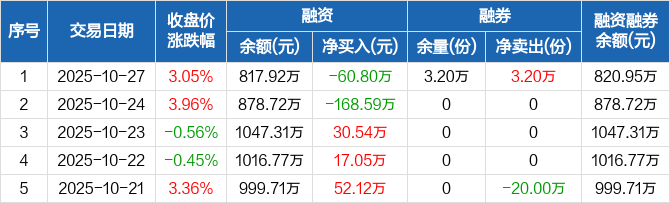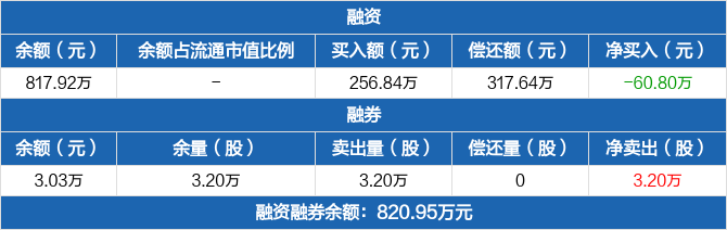 融资方面,当日融资买入256.84万元,融资偿还317.64万元,融资净偿还60.8万元。融券方面,融券卖出3.2万份,融券偿还0份,融券余量3.2万份,融券余额3.03万元。融资融券余额合计820.95万元。