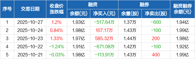 融资方面,当日融资买入1736.49万元,融资偿还2254.13万元,融资净偿还517.64万元。融券方面,融券卖出0股,融券偿还600股,融券余量1.37万股,融券余额41.59万元。融资融券余额合计1.94亿元。