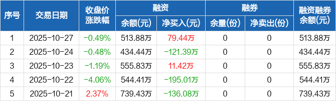 金ETF融资融券信息显示,2025年10月27日融资净买入79.44万元;融资余额513.88万元,较前一日增加18.29%。