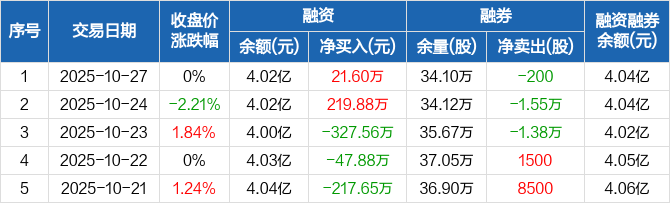 融资方面,当日融资买入527.95万元,融资偿还506.35万元,融资净买入21.6万元。融券方面,融券卖出300股,融券偿还500股,融券余量34.1万股,融券余额166.07万元。融资融券余额合计4.04亿元。