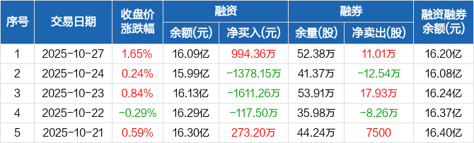 融资方面,当日融资买入8420.27万元,融资偿还7425.91万元,融资净买入994.36万元。融券方面,融券卖出12.22万股,融券偿还1.21万股,融券余量52.38万股,融券余额1094.22万元。融资融券余额合计16.2亿元。