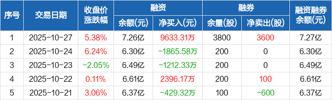 融资方面,当日融资买入2.25亿元,融资偿还1.29亿元,融资净买入9633.31万元。融券方面,融券卖出3600股,融券偿还0股,融券余量3800股,融券余额80.01万元。融资融券余额合计7.27亿元。