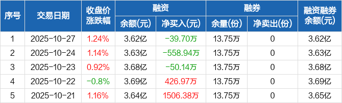 融资方面,当日融资买入5711.84万元,融资偿还5751.53万元,融资净偿还39.7万元,连续3日净偿还累计648.77万元。融券方面,融券卖出0份,融券偿还0份,融券余量13.75万份,融券余额12.31万元。融资融券余额合计3.62亿元。