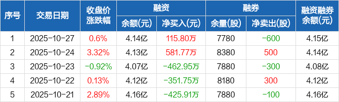 融资方面,当日融资买入3382.75万元,融资偿还3266.95万元,融资净买入115.8万元。融券方面,融券卖出0股,融券偿还600股,融券余量7780股,融券余额41.94万元。融资融券余额合计4.15亿元。