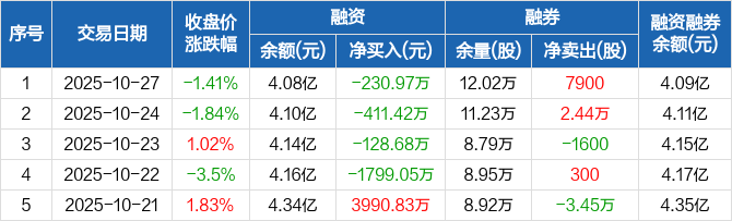 融资方面,当日融资买入3485.4万元,融资偿还3716.37万元,融资净偿还230.97万元,连续4日净偿还累计2570.13万元。融券方面,融券卖出9900股,融券偿还2000股,融券余量12.02万股,融券余额126.21万元。融资融券余额合计4.09亿元。