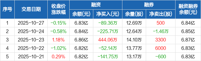 融资方面,当日融资买入969.18万元,融资偿还1058.54万元,融资净偿还89.36万元。融券方面,融券卖出600股,融券偿还100股,融券余量12.69万股,融券余额86.29万元。融资融券余额合计6.84亿元。