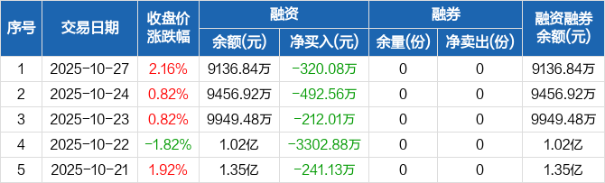 融资方面,当日融资买入3247.33万元,融资偿还3567.41万元,融资净偿还320.08万元,连续6日净偿还累计5484.68万元。融券方面,融券卖出0份,融券偿还0份,融券余量0份,融券余额0元。融资融券余额合计9136.84万元。