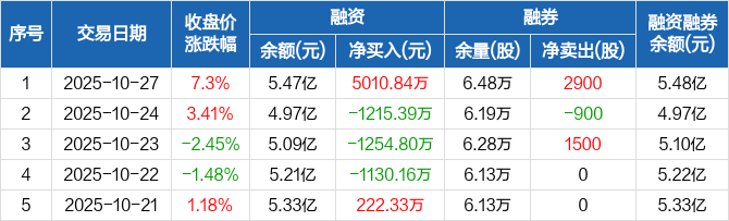 融资方面,当日融资买入1.3亿元,融资偿还8019.16万元,融资净买入5010.84万元。融券方面,融券卖出2900股,融券偿还0股,融券余量6.48万股,融券余额88.58万元。融资融券余额合计5.48亿元。