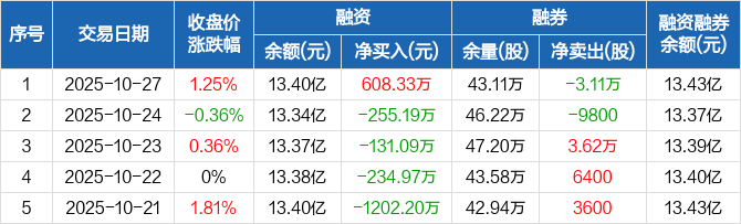 融资方面,当日融资买入3166.61万元,融资偿还2558.28万元,融资净买入608.33万元。融券方面,融券卖出2.11万股,融券偿还5.22万股,融券余量43.11万股,融券余额244万元。融资融券余额合计13.43亿元。